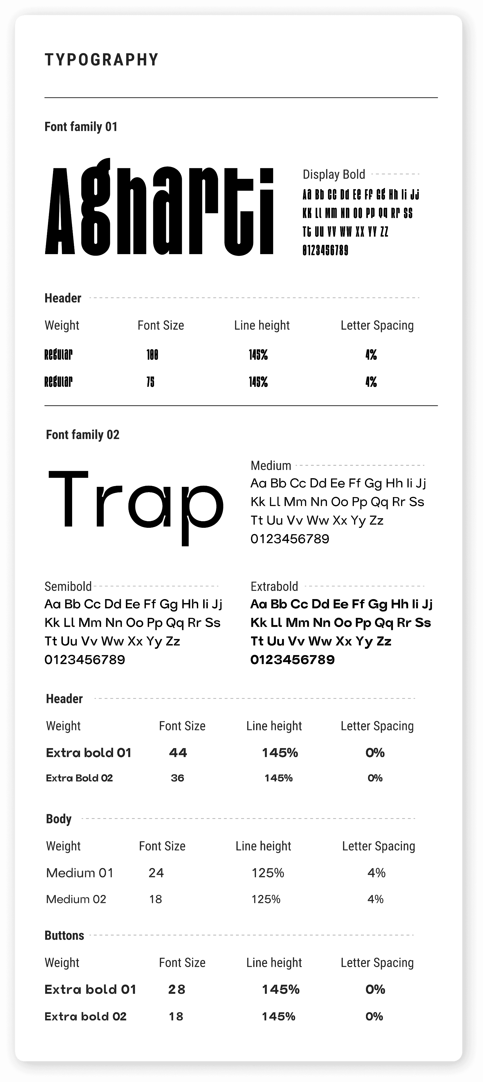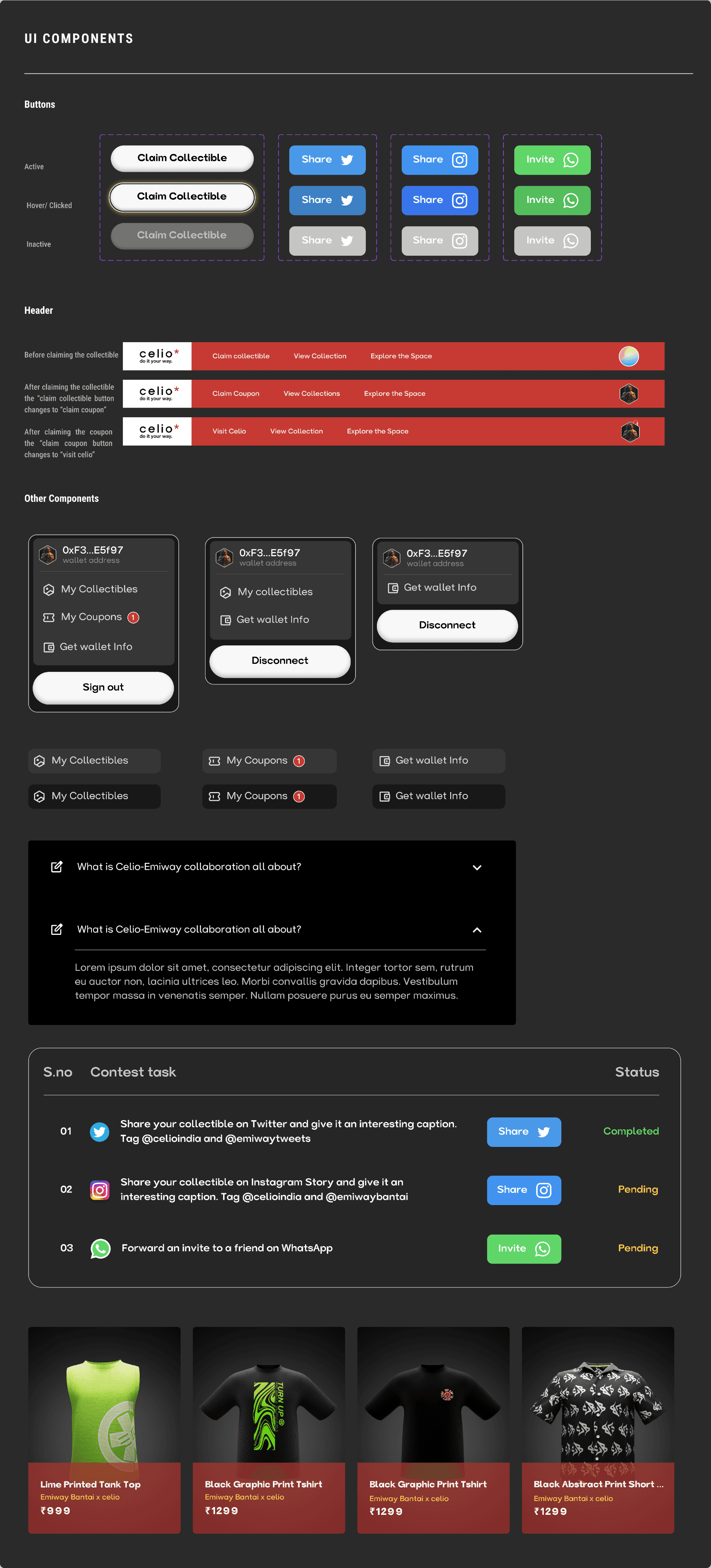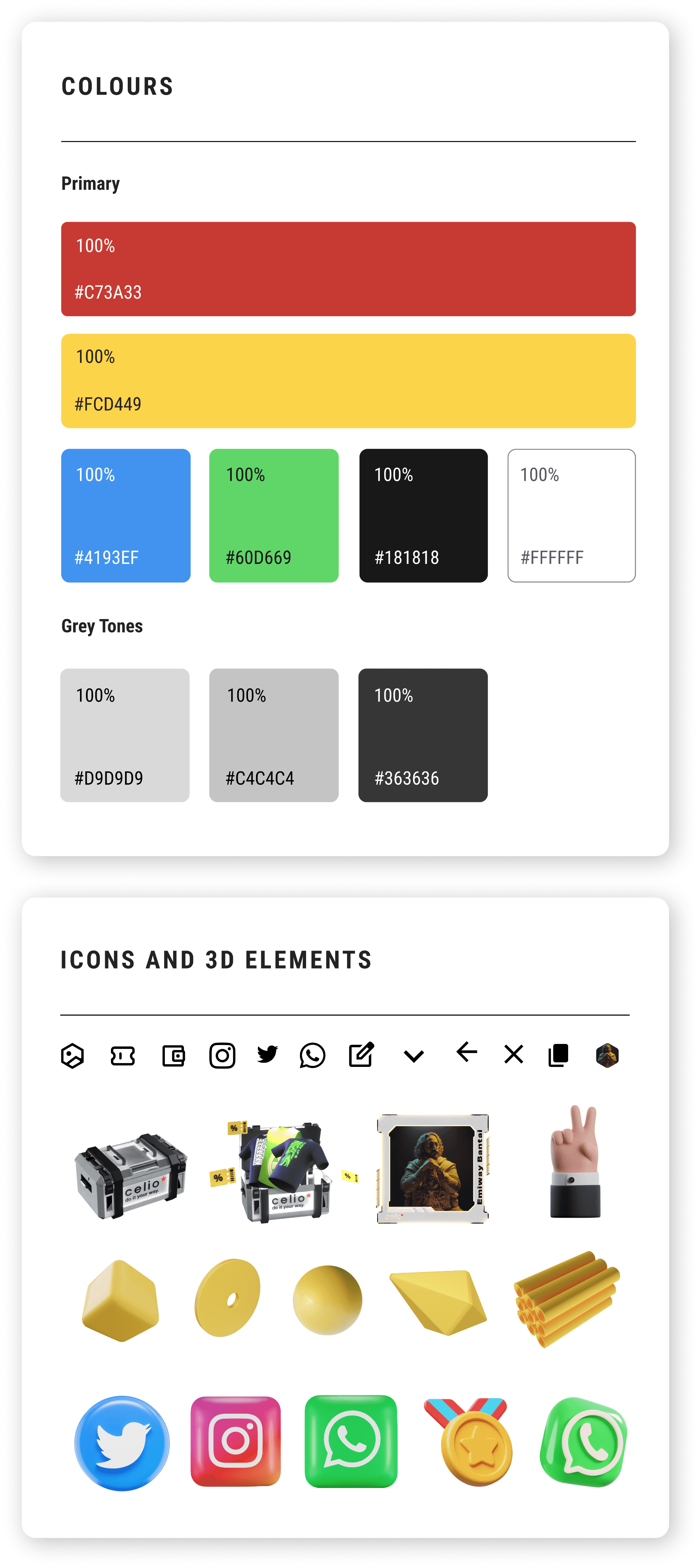 The Celio X Emiway collaboration style guide reflects a bold, modern aesthetic that captures the energy of streetwear fashion and youth culture. The typography blends the raw, edgy feel of Agharti for headers with the clean, minimal look of Trap for body text, balancing intensity with readability. The colour palette uses red and black to reflect Celio's bold brand identity, red and black providing sleek contrast. Yellow is used to elevate the streetwear vibe. Playful 3D icons and elements, including merchandise and NFT representations, enhance engagement and give the site a dynamic feel.