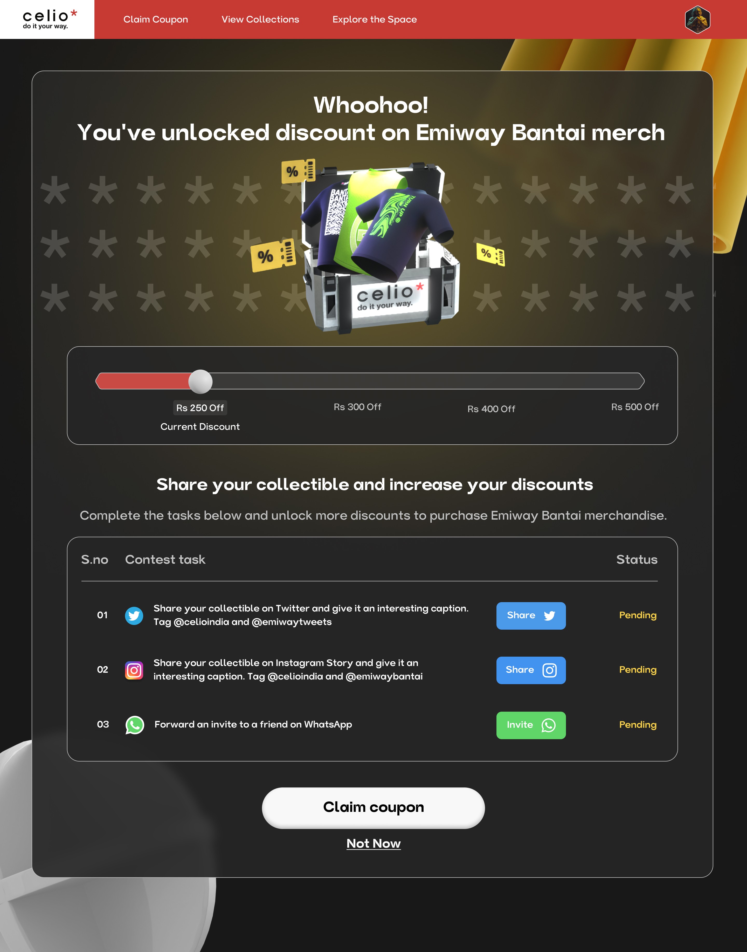 NFTs and digital collectibles are transforming brand engagement, with more companies moving into Web 3. Collaborating with Celio, I helped create a microsite for the #DoItYourWay campaign, offering exclusive Emiway NFTs alongside merchandise, contests, and a seamless shopping experience, driving brand interaction in this new digital space.